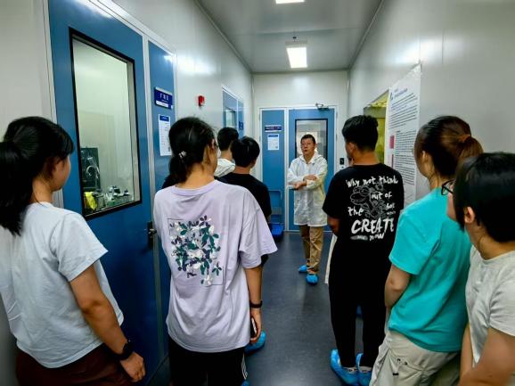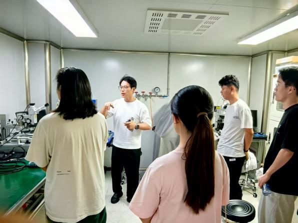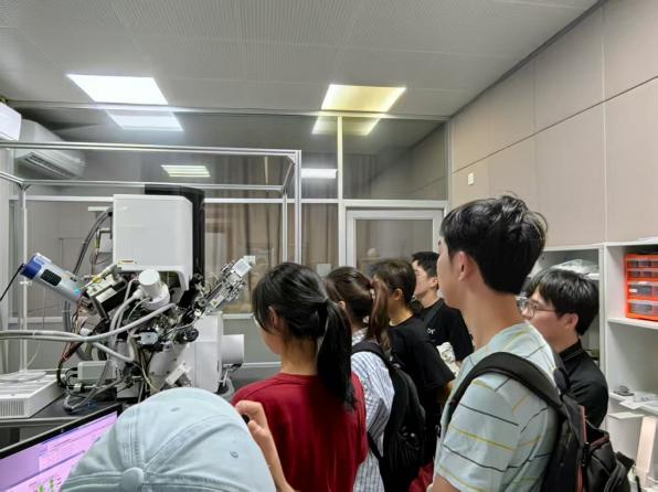 接着,同学们走进研究所的重点实验室进行参观。实验室涵盖半导体物理、材料科学、器件制造等多个前沿领域,并设有专门从事微纳结构加工与表征的实验中心。在自旋电子学、低维半导体与量子输运等物理实验平台上,各类高精度仪器设备有序运行,如扫描电子显微镜、原子力显微镜、超快激光光谱仪等。科研人员为同学们详细讲解了这些设备的工作原理及其在实际科研项目中的应用。大家沉浸在浓厚的科研氛围中,积极与一线科研人员交流提问,将讲座中所学的前沿理论与眼前的实验装置相结合,实现了从抽象概念到具体实践的理解升华。