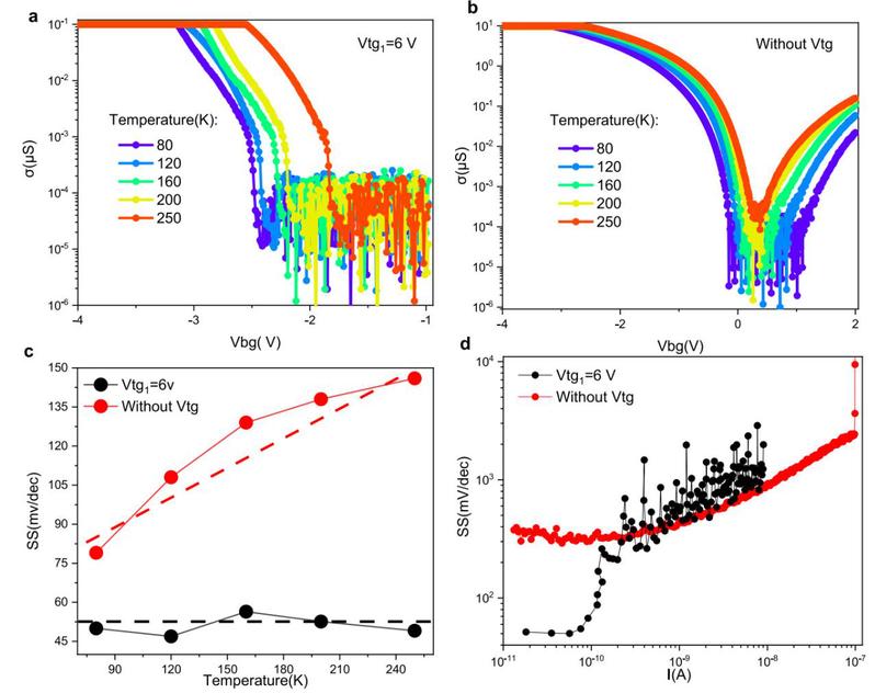 图4 :亚阈值摆幅(SS)与开启阈值的关联性。a. 通过光响应测量提取的传统FET(红色)与光隧穿晶体管(黑色)响应度对比,显示光隧穿晶体管具有更优的阈值功率但响应度较低。b. 实测传统FET(红色)与光隧穿晶体管(黑色)的阈值功率随温度变化关系,曲线可划分为两个特征区域,揭示了电荷注入机制对阈值功率的决定性作用。c. 不同顶栅电压(Vtg1)下器件的转移特性曲线,显示SS随Vtg1连续调控,灰色虚线标示SS=60 mV/dec的参考斜率(Vds=0.1V)。d. 对应(c)中配置的实测阈值功率与SS的函数关系。