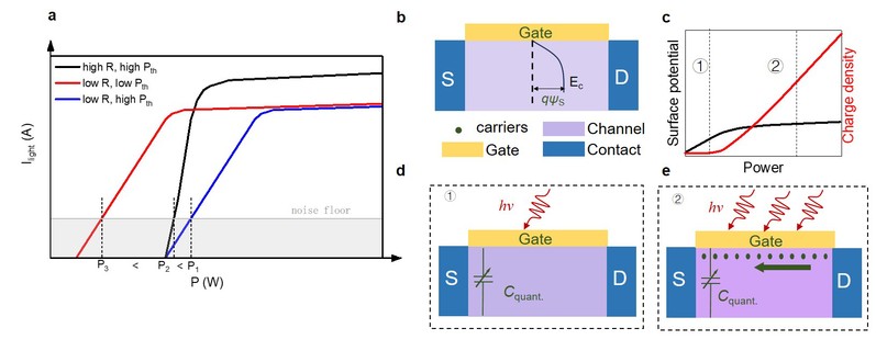图1:光电晶体管开启阈值功率的概念与原理。a,光电探测器阈值功率示意图。两个光电晶体管的最小可探测功率由其探测率决定(P1和P2)。另一个具有优化检测极限的探测器展现出更好的阈值功率(P3),尽管其响应度(R)较低。b,光电晶体管阈值功率的起源(由源极(S)、漏极(D)和栅极定义)。c,阈值以下(区域1)和以上(区域2)的沟道电荷,箭头表示光电流方向。d,光(ℎν)照射下的光电晶体管结构;e,光电晶体管沟道的表面电势和电荷密度随入射光功率的变化关系。