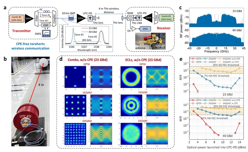 进一步地,研究团队构建了超宽带光子太赫兹通信系统,基于双克尔梳架构与太赫兹基波混频方案,实现了无需载波相位恢复的极简太赫兹通信,有效降低了系统接收端的复杂度与功耗,验证了低噪声太赫兹信号在高速无线通信中的可行性与优势。