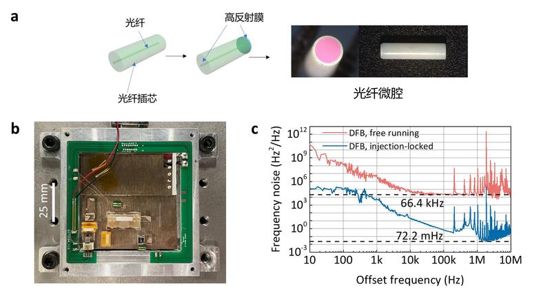 在此基础上,研究团队将品质因子高达6×10⁸的光纤微腔与DFB激光芯片进行集成化封装,基于自注入锁定效应实现泵浦激光超高倍数线宽压缩,将商用DFB激光器的基础线宽压缩至72.2 mHz,封装尺寸仅85 mm × 90 mm × 25 mm。