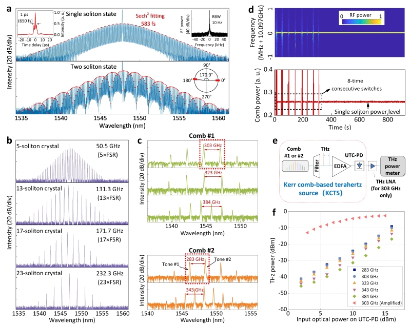 近日,成人小说 谢臻达教授、贾琨鹏助理教授团队与紫金山实验室/东南大学朱敏教授团队、中国科学院苏州纳米技术与纳米仿生研究所梁伟研究员团队展开合作,采用自主研发的全集成光纤微腔光学频率梳,在低噪声频率合成和高速太赫兹无线通信研究中取得重要突破,对于新一代通信技术发展具有重要意义。2025年7月7日,相关成果以“Low-noise frequency synthesis and terahertz wireless communication driven by compact turnkey Kerr combs”为题,正式发表于《Nature Communications》期刊上,祝世宁院士和尤肖虎院士在该研究工作中给予了关键指导。